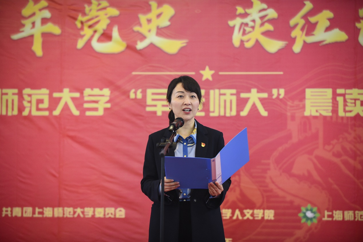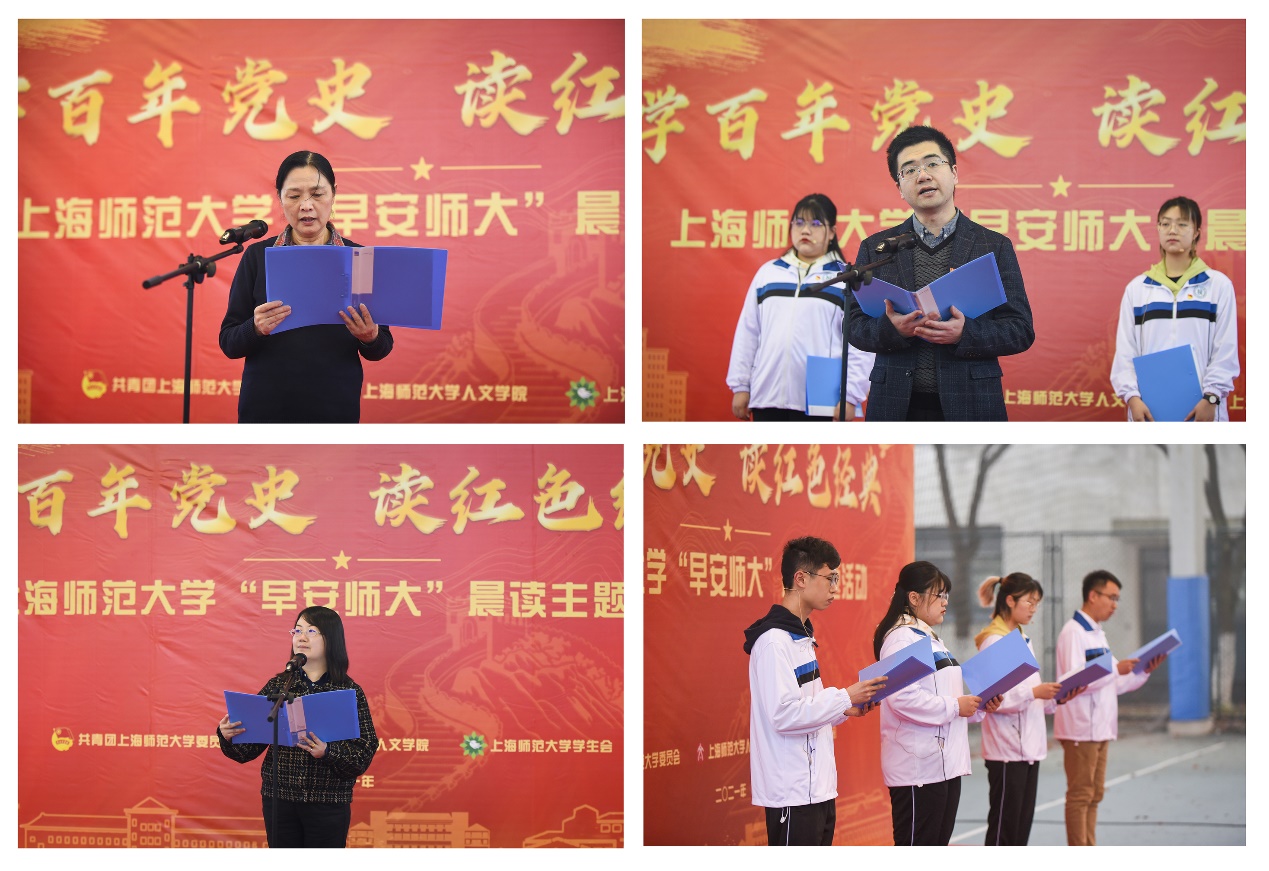 旭日初升时,郎朗书声起。41日晨, “早安师大”晨读主题活动在奉贤校区篮球场举行,校团委、人文学院党政领导、专业教师代表,学院2021年上半年入党发展对象、2020级本科班团骨干、高中高校推优一体化青马学员参加活动。本次主题活动由校团委、人文学院和校学生会共同策划,号召大家学百年党史,读红色经典。