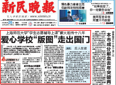 “薪火相传,凝聚在同一目标下。”这与其说是句口号,不如说是一场情真意切的接力赛。据最新统计,截至今年寒假,始于1994年的上海师范大学“爱心学校”,十八年来已先后在全国18个省市及香港、澳门地区开出了1900余所分校,还辐射到了美国、韩国、日本、澳大利亚等国,参与的大学生志愿者多达5万余人,服务的各类人群约15万人次。“爱心学校”是该校大学生利用所学的知识奉献社会的一个舞台,也成为上海大学生社会实践的一个优秀品牌。
