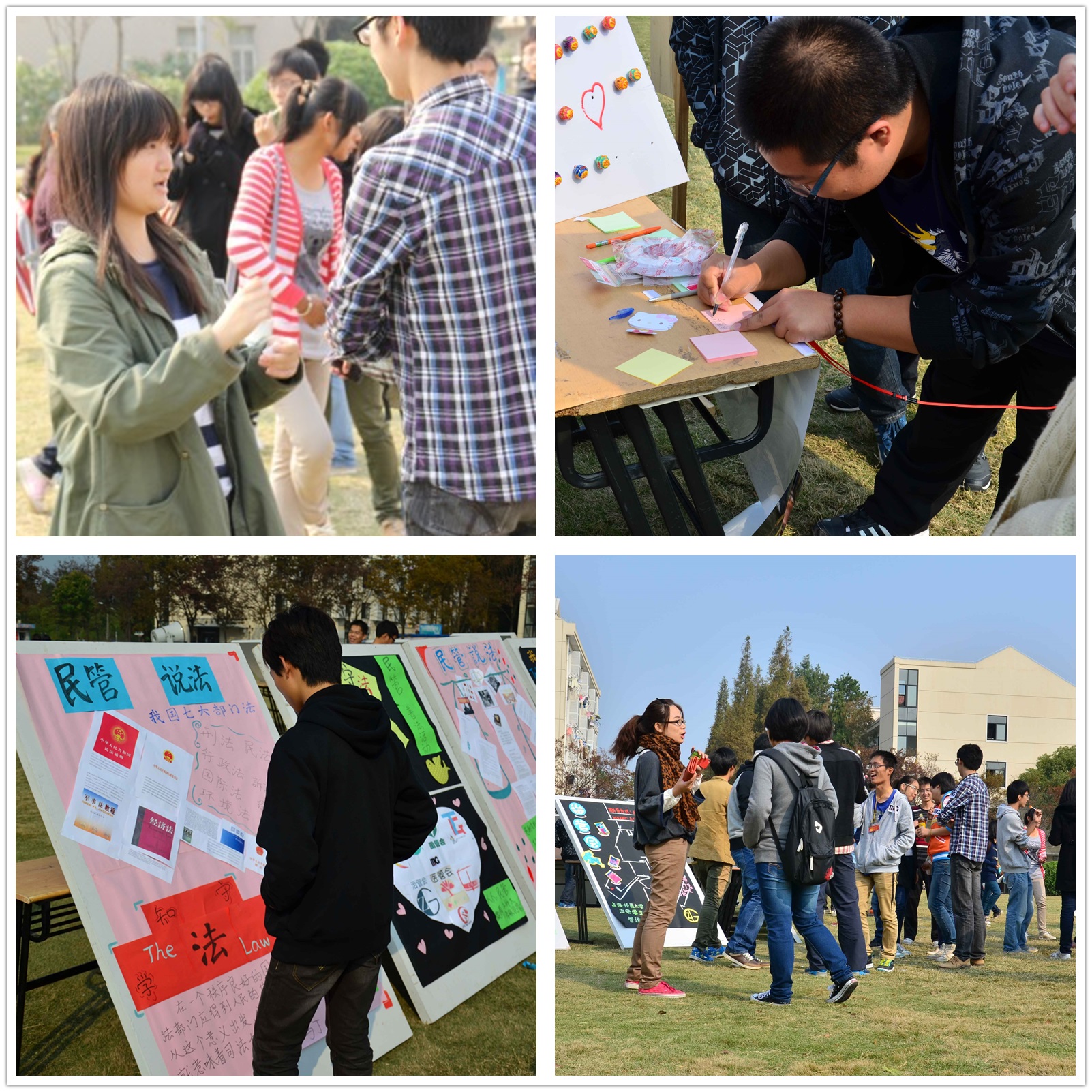 芝兰法学社——心中有法,拒绝不法 开学至今,我校徐汇奉贤两校区,陆续发生了十几起诈骗案件,引起了广大师生的关注。法学社提供的展板上,有七大基本法律的知识,让学生心中初步形成法律的框架,增进法律知识。同时展板还介绍了如何维护自身权益,给学生们提供建议与帮助,提高法律意识。很多同学在展板前仔细阅读,认真听取讲解员的介绍。法学社副社长王冰阳道出了活动的意义:“我们为同学们普及法律知识,帮助他们提高自身的法律意识,运用法律武器维护自身的权益。希望我们与民管会的合作的‘户外法学讲堂’成为同学们学法懂法的一个有效平台,以减少校园诈骗等不良事件的发生。” 民管之八大管会——各司其职,以“民”为天 活动不仅宣传基本法律知识,同时还介绍了民管会的八大管会的基本职能,让学生深入了解民管会,现场另有管会同学发给参观者管会LOGO的图章。“谢谢!”许多参与这次活动的学生对给他们贴上民管会LOGO的工作人员如是说,对方则回报以更温和的微笑。八大管会以展板的形式生动地介绍各自的职能,同时还有各个管会的解说员细致讲解,以便参观学生都能清楚了解。八大管会中,教管会介绍了考试作弊处理条例以及特色的课间铃活动;车管会为大家提供出行指南以及抵制黑车的活动;医管会为师生们建立与校医院的平台;治管会为大家找到遗失物品等;宿管会是大家寝室问题的可倾诉方;体管会宣传各种体育活动、维持同学们的敲卡秩序;图管会是大家与图书馆的良好纽带;伙管会为大家介绍了浴室与食堂的情况。各管会热情为大家解说服务,将活动气氛推向了高潮。