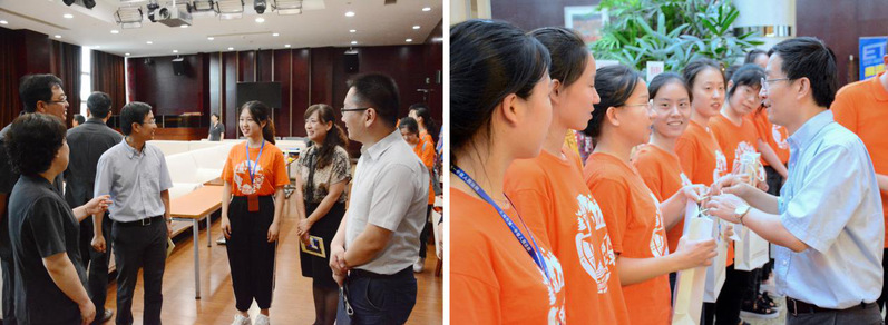 7月31日,2019年暑期社会实践已开展一个月,炎炎夏日里,师大“小橙子”们始终洋溢着饱满的热情,挥洒着青春的汗水,坚守在各个实践岗位上。上午,上海市第一中级人民法院副院长刘力,校党委副书记、副校长葛卫华及相关职能部门和学院负责人慰问了一中院职工亲子工作室的志愿者。随后,普陀区委常委、区委副书记姜冬冬与校领导一同慰问在普陀区参加暑期社会实践活动的大学生,并出席暑期大学生挂职锻炼座谈会。