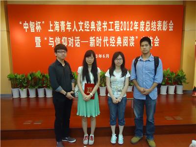 6月26日上午,由团市委与中智上海经济技术合作公司共同主办的“中智杯”上海青年人文经典读书工程召开年度表彰大会。团市委副书记杨元飞、团市委学校部部长陈立俊、中智上海经济技术合作公司副总经理傅震等领导出席了本次活动。我校人文学院4名学生作为获奖代表参加表彰大会。