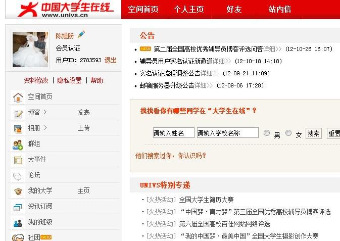 前期资料已经准备完毕,现在应经进入投票阶段。投票为评选的一个重要部分,每一张票都很珍贵喲!! 为避免刷票,此次投票稍微复杂一些。下面是详细的投票过程: 1、打开中国大学生在线http://www.univs.cn/ 2、点击“登陆”页面会弹出 然后一步步填写,此过程大家会非常熟悉。注册结束后,保存好资料, 再进行用户认证,便于投票。