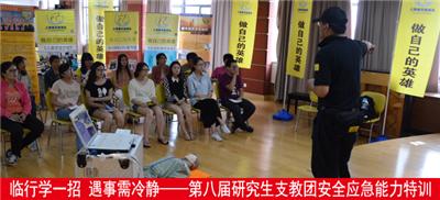 整个安全应急能力特训围绕四个生活中常见多发危险情况展开:地震自救、防溺水、崴脚应对、院前急救。两位老师还特地针对支教团即将奔赴的地区,详细讲述了对于当地特殊环境及可能发生的自然灾害的应对措施。两个多小时的安全应急能力特训,让支教团成员对于即将到来的支教生活更加充满信心。