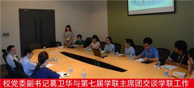 7月4日下午,校党委副书记葛卫华在徐汇校区会议中心与校第七届学生联合会主席团展开亲切座谈。同时参与座谈会的还有校团委书记史佳华、校团委副书记杨纯婷。座谈会由校团委书记史佳华主持。 第七届校学联主席陈冬尔就2014—2015学年学联工作重点及内部体制建设向校党委副书记葛卫华进行了简要阐述,学联主席团各成员根据自换届以来一个月来的工作体会分别从工作难点、工作设想、部门建设等方面与葛书记进行了汇报。