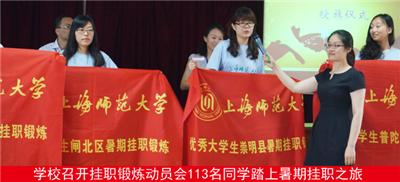 2014年7月4日上午,上海师范大学2014年优秀大学生暑期挂职锻炼动员会在徐汇校区香樟苑四楼多功能厅举行。校党委组织部副部长曹鹏、校团委副书记万瑾分别作动员,113名暑期挂职大学生出席动员会,会议由校团委组织部部长颜彦主持。