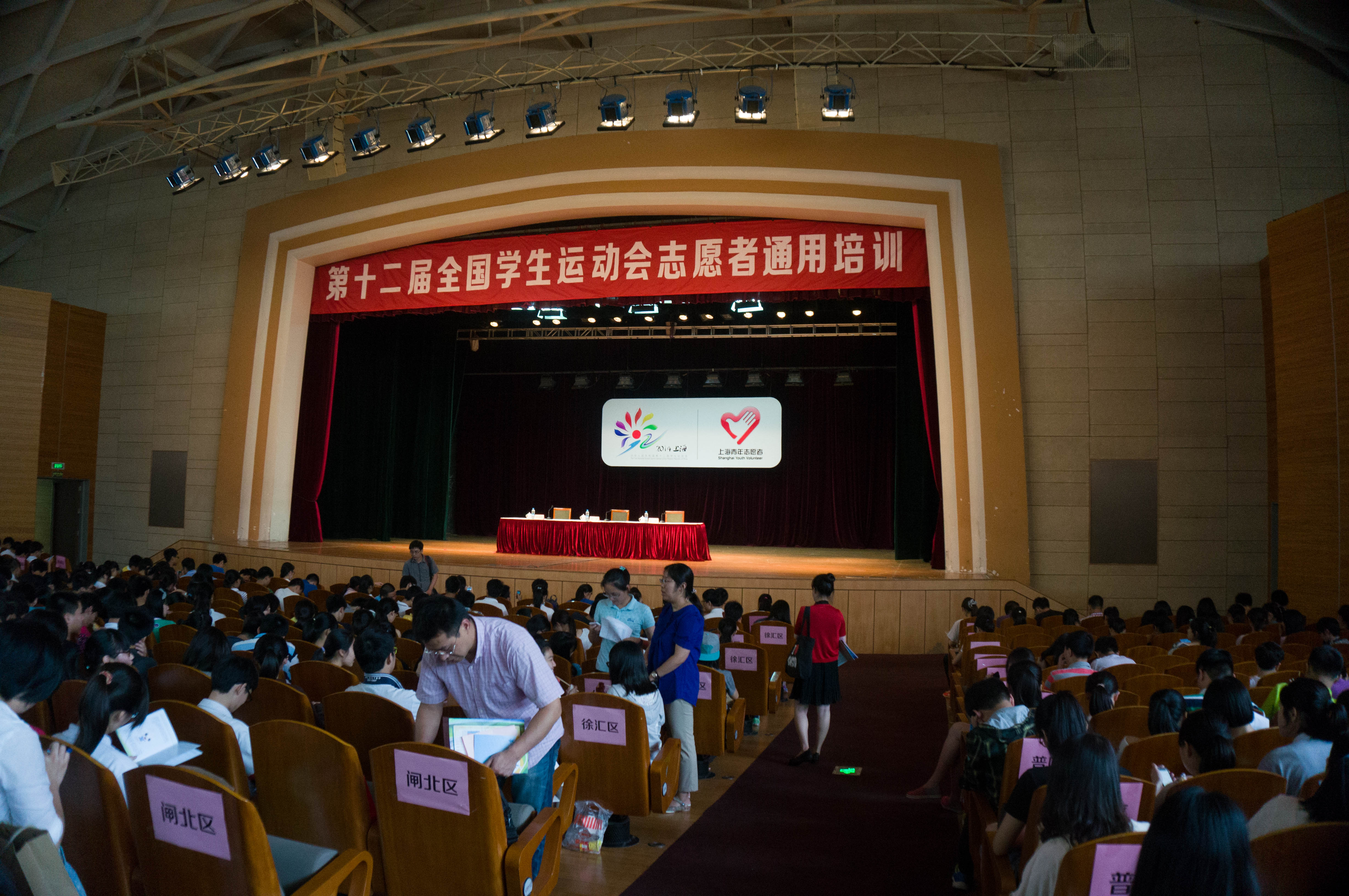 2014年7月3日,第十二届全国学生运动会志愿者通用知识培训在同济大学大礼堂举行。通过选拔的932名中学生及476名大学生共1408名青年志愿者参与了本次培训。会议由团市委副书记、筹委会秘书长刘刚主持,市教委副主任、筹委会执行秘书长王平做了动员讲话。