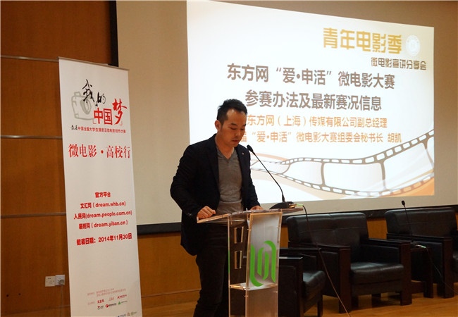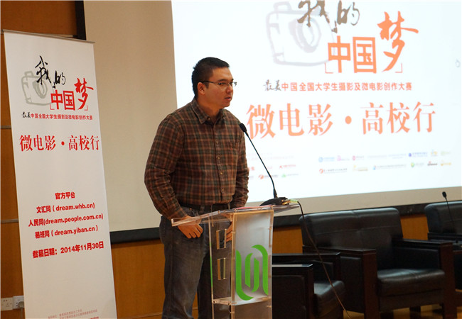 ![]() 宣讲会伊始,东方网(上海)传媒有限公司副总经理、首届“爱•申活”微电影大赛组委会秘书长胡凯介绍参赛办法以及最新赛况信息,文汇报新媒体中心叶松亭老师也向大家介绍“我的中国梦”最美中国全国大学生摄影及微电影大赛,并鼓励同学们积极参与其中。随后,大屏幕上播放了《疯娘》、《误入奇途》两部学生作品。