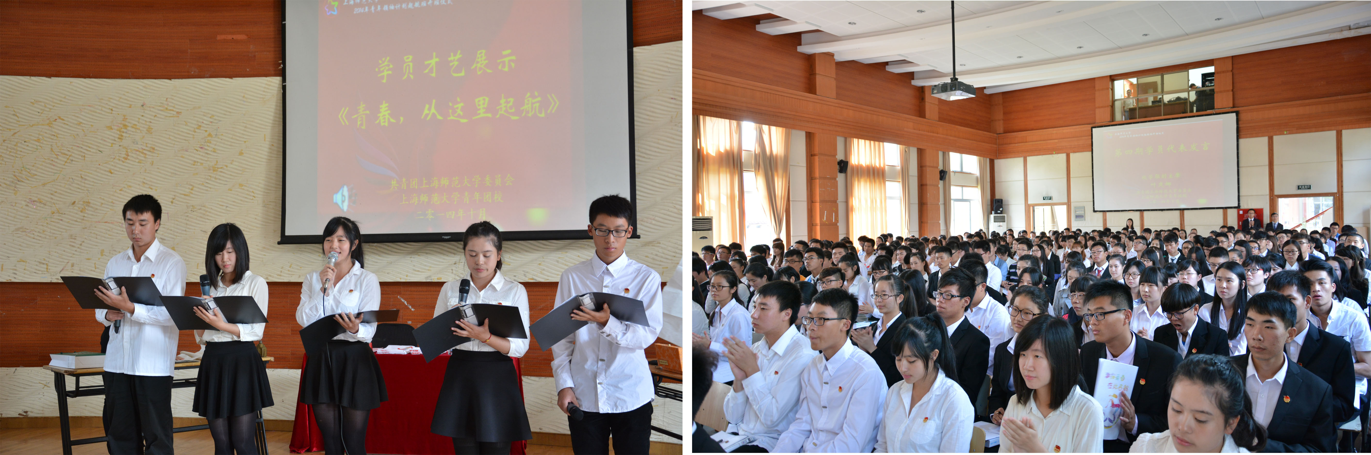 校团委副书记、校青年团校副校长万瑾作开班致辞。万瑾介绍了本期培训班的特色与创新,寄语学员努力做让团委放心、让同学满意、的学生干部。校学联副主席王丽珺介绍了学员挂职的具体事宜;新老学员代表校学联副主席叶爽娜、谢晋学院新生于程等进行交流发言。第五期学员带来了才艺诗朗诵《青春》和书法作品《起航》。全体学员以嘹亮的誓言,表达了励志成才的决心与信心。