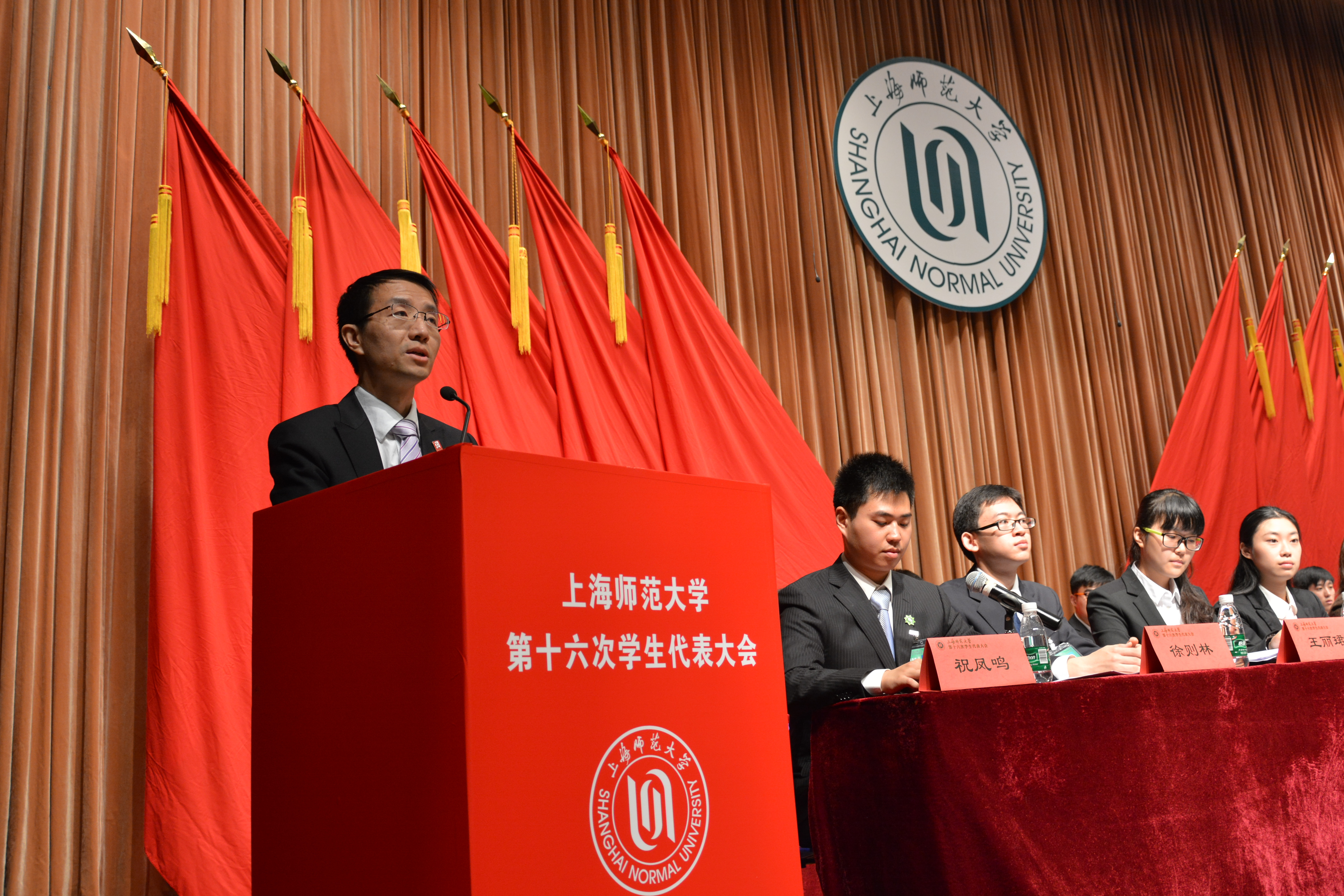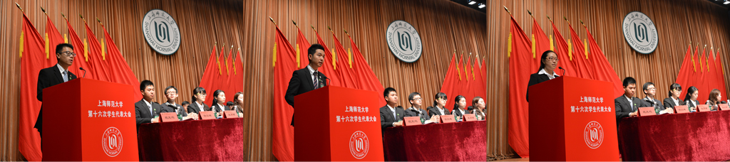上海交通大学学生联合会主席邵宪一代表兄弟院校向大会致贺辞,上海市学生联合会执行主席李卓航应邀出席并致辞。上海外国语大学、上海财经大学、上海第二工业大学等兄弟院校的学生会也在本次学代会召开之际向大会发来贺信。上海师范大学学生联合会主席陈冬尔代表第十五届学生委员会作了题为《坚定理想信念,奉献青春力量,为实现中国梦砥砺前行》的工作报告。 下午,各代表团积极参与《上海师范大学第十五届学生委员会工作报告》的审议以及《上海师范大学第十六届学生委员会委员候选人名单》的酝酿与讨论,代表们畅所欲言,积极为校园的建设发展建言献策。全体代表经民主投票,选举产生了新一届学生委员会委员。