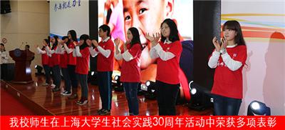 11月19日下午,由上海市委宣传部、市文明办、市教卫工作党委、市教委、团市委和市学联主办的上海大学生社会实践30周年成果展示会暨2014年上海市大学生暑期社会实践总结大会在上海交通大学隆重举行。市政府副秘书长吴建融出席会议并讲话。团市委等主办单位领导、参与和支持大学生社会实践的相关委办局代表以及各高校团组织负责人参加大会。校团委负责人、获奖师生代表等参与本次大会。在当天的成果展示会的现场,我校作为十大项目代表,献上了爱心学校原创歌舞剧《唱出爱》中的曲目《你的名字》手语表演,展现了我校大学生的志愿风采。