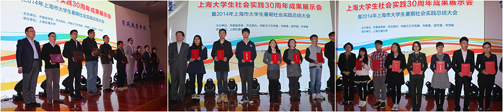 ![]() 大会表彰了一批在活动中表现突出的项目、个人和集体,我校凭借出色的社会实践工作获得多项荣誉:学校荣获“最佳组织奖”;“爱心学校”项目荣获“上海市大学生社会实践30周年十大最具影响力项目”;“桃浦镇爱心暑托班”项目荣获2014年上海市大学生暑期社会实践活动最佳项目奖;“DREAMHIGH志愿者支教活动”等7个项目荣获优秀项目奖,“知行杯”三等奖1项,优秀奖1项,2014年暑期社会实践先进个人4人,优秀指导教师2人。