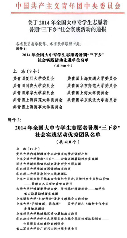 2014年5月,中宣部、中央文明办、教育部、共青团中央、全国学联等联合下发文件,部署开展了以“为祖国勤学修德 以实践明辨笃实”为主题的大中专学生志愿者暑期“三下乡”社会实践活动。2014年12月,团中央学校部、全国学联秘书处决定对在2014年全国大中专学生志愿者暑期“三下乡”社会实践活动表现突出的先进单位和优秀实践团体进行通报表扬。我校凭借组织有序,丰富多样的暑期社会实践活动,荣膺先进单位荣誉称号;而我校桃浦社区爱心暑托班也以较大的社会影响和广泛的社会认可荣获优秀实践团体荣誉称号。 据悉,今年寒假期间我校即将开展主题为“法治力量,青年使命”的社会实践系列活动。我校各级团组织将不断扩大实践育人覆盖面,不断提高社会实践工作的常态性、专业性和时效性,不断探索新形势下实践育人优势的发挥,为深入开展培育和践行社会主义核心价值观活动,以广大青年群体为重点对象,培养社会主义事业合格建设者和可靠接班人作出新的努力和贡献。