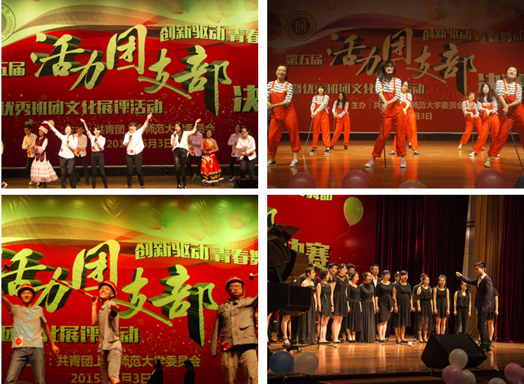 来自旅游学院2014级旅游管理3班团支部的表演别出心裁,几位支部成员“化身”皇帝丞相,以丝绸之路张骞出使西域的历史背景,通过新疆舞、印度舞、敦煌舞展现了西域风情,也展现出“一带一路”的时代规划和别样的青春精彩。音乐学院的2014级舞蹈学的民族舞用专业的舞蹈功力征服了观众,用肢体语言阐释了刚柔并济,美轮美奂。来自美术学院2014级美术师范3班团支部改编了《第八套广播体操》,创意与视觉享受并存,充分体现了他们作为美术生的特色。外国语学院2014级英语2班团支部的成员俨然是仙女下凡,穿着仙女服翩翩起舞,中西结合的穿越表演可谓创意十足,全场英语旁白加上男女英文歌对唱充分体现了他们的支部魅力。研究生数理学院2013级研究生团支部在《梦中的婚礼》伴奏下娓娓道来他们的支部介绍,文艺情怀一过,一首《小苹果》舞蹈带动了整个舞台,让我们都感受到了他们“后青春”的风采。