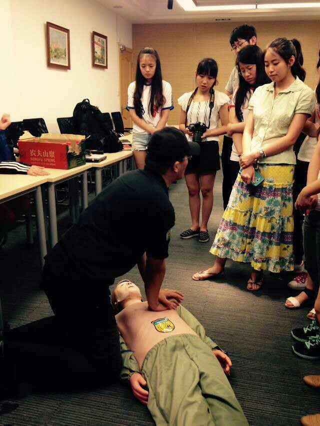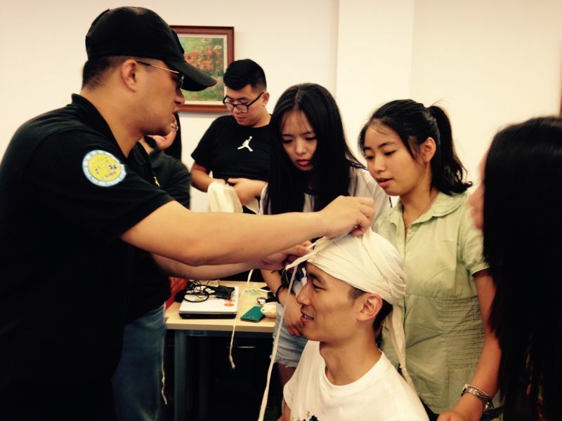 2015年6月26日,上海师范大学第九届研究生支教团成员在香樟苑401进行安全急救主题团训。本届研究生支教团即将前往广西、甘肃两地支教,工作环境较为复杂,有需要自救和救人的可能,校团委特地组织支教团成员进行安全救护培训。