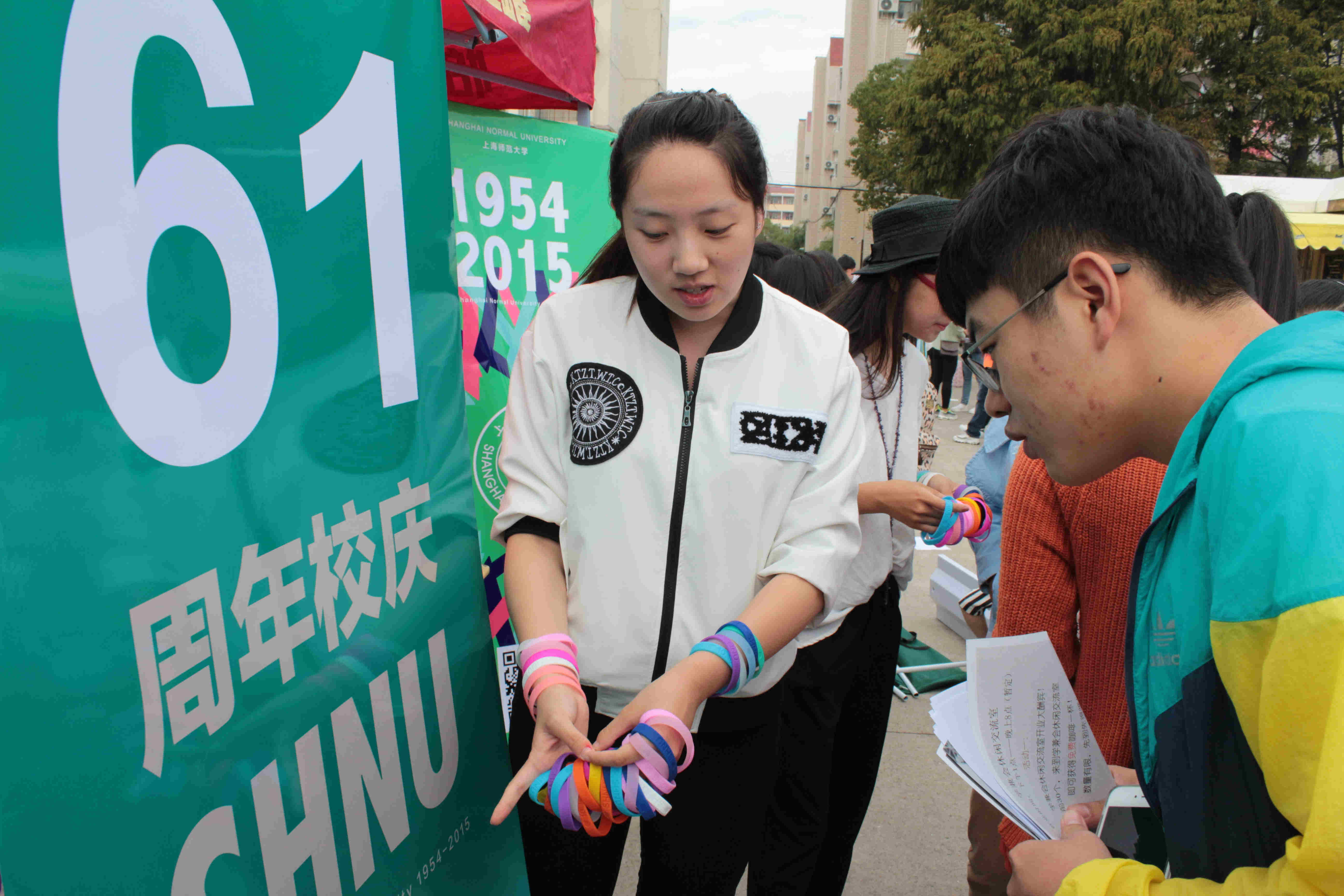 恰逢校庆61周年之际,校园大使们在开幕式现场为学子发放校庆手环,共同庆祝母校的61岁华诞。同学们聆听校园大使对校史校情的介绍,在签名墙上写下心中对于师大的祝福。