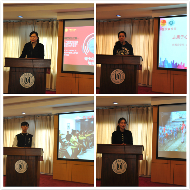 会上公布了2015年暑期社会实践活动的评选结果,颁发了学院 “最佳组织奖”、“优秀组织奖”;表彰了 101个暑期社会实践项目荣获“优秀项目”;263名“先进个人”;27名“优秀指导教师”。 ![]() 旅游学院盖云云同学、体育学院朱思尧同学、外国语学院缪斯同学在会上分享了暑期社会实践的感受。已经连续两年参与社会实践活动的盖云云同学说:“井冈山的挂职培训于我而言意味着新的挑战与收获,每一次经历都是我成长路上值得收藏的美丽风景。”朱思尧同学不仅在暑假担任上海国际青少年足球邀请赛的志愿者,也是爱心学校的老师,他说:“爱心学校于我的感触最深,在给学生们上武术课的时候,看着他们期盼的眼神,我感受到了前所未有的快乐。足球比赛的志愿者也使我深刻体会到了作为团队负责人精准把控情况的重要性。”新生代表缪斯同学说:“社会实践是我了解社会、重新认识自我的重要途径,参加社会实践活动让我更好地理解了青年的责任。”