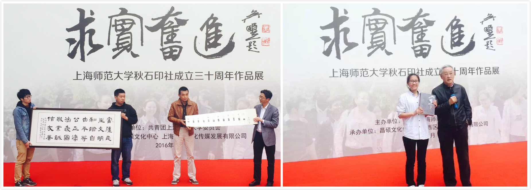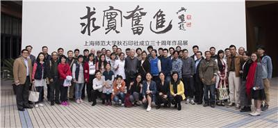 4月9日,《求实奋进——上海师范大学秋石印社成立三十周年作品展》开幕式在昌硕文化中心隆重举行。闵行区宣传部、新虹街道党工委领导出席,吴昌硕艺术研究会、杨高印社及其他印社来宾到场祝贺。上午社团还举行了新虹街道居民义刻活动。