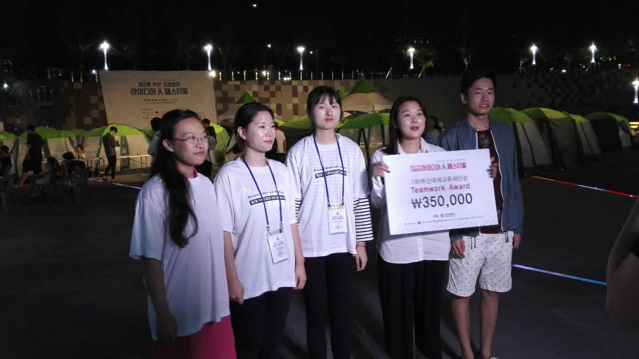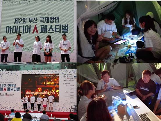 ![]() 中日韩三方共有300人参加,分成60支参赛队伍,我校10名队员被分配到5个小组中,与韩方3名学生共同组成创业团队进行合作。这次活动最大特点是所有参赛队伍都要住在露营的帐篷里,晚上没有休息时间,通宵协作,在规定的48小时内完成创业项目发布。这既是一次别样的体验又是一次创业的考验,队员们克服天气炎热、语言障碍等问题,通宵研讨交流,所有队员最终都在规定时间内完成了创业项目的展示。