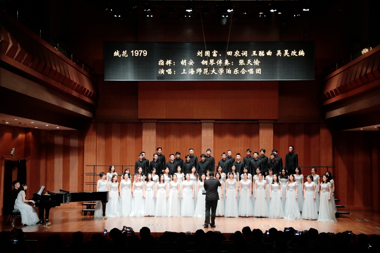 泊乐合唱团在演出中先后为大家表演了《绒花》和《东方之珠》。前一首合唱改编自电影《小花》插曲,展现抗日时期红军战士在极端艰苦的环境下英勇地奋战一线的赴死决心,同时军民一心的浓浓深情又为这首悲壮之歌抹上温暖的红色;后一曲广泛传唱于1997年香港回归之际,表达了人民群众深厚的爱国主义情怀和海外游子浓重的乡愁。在节目的最后,泊乐合唱团还与上海社会科学界合唱团共同合作献唱了《我们走进十月的阳光》《难忘今宵》,唱响对国家繁荣发展的殷切期盼,在全场掀起高潮。