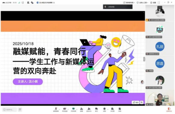 校团委媒体宣传中心副主任沈小棋,从“时效性”“责任心”剖析学生工作底层逻辑,讲清 “为何重时效” 、“校园新媒体账号的定位与差异化打造”等探索“工作+宣传”破圈路等内容,进行“融媒赋能·青春领航:学生工作与新媒体运营的双向奔赴”主题讲解。