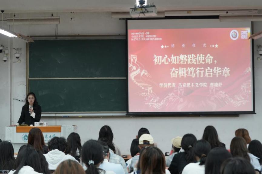 马克思主义学院社团管理部负责人曹婕妤同学作为学员代表分享学习心得。她认为此次培训深化了学员对服务使命的认知,系统学习党的二十大精神强化了政治素养,课程助力综合能力提升,更促其与集体共成长。