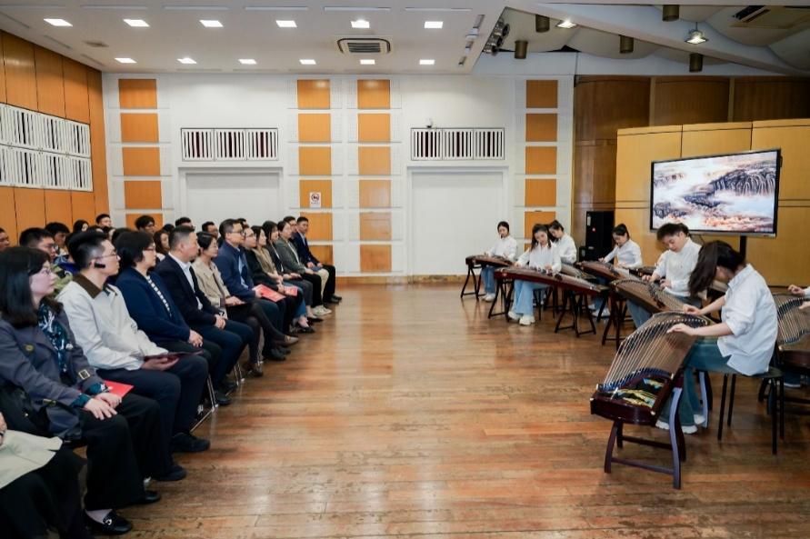 最后,考察组一行来到小音乐厅,欣赏了由我校音乐学院玉兰筝团带来古筝重奏《黄河》,展现学校通过主动排演主旋律艺术作品,弘扬爱国主义教育,着力培养合格的社会主义艺术工作者的教学成果。