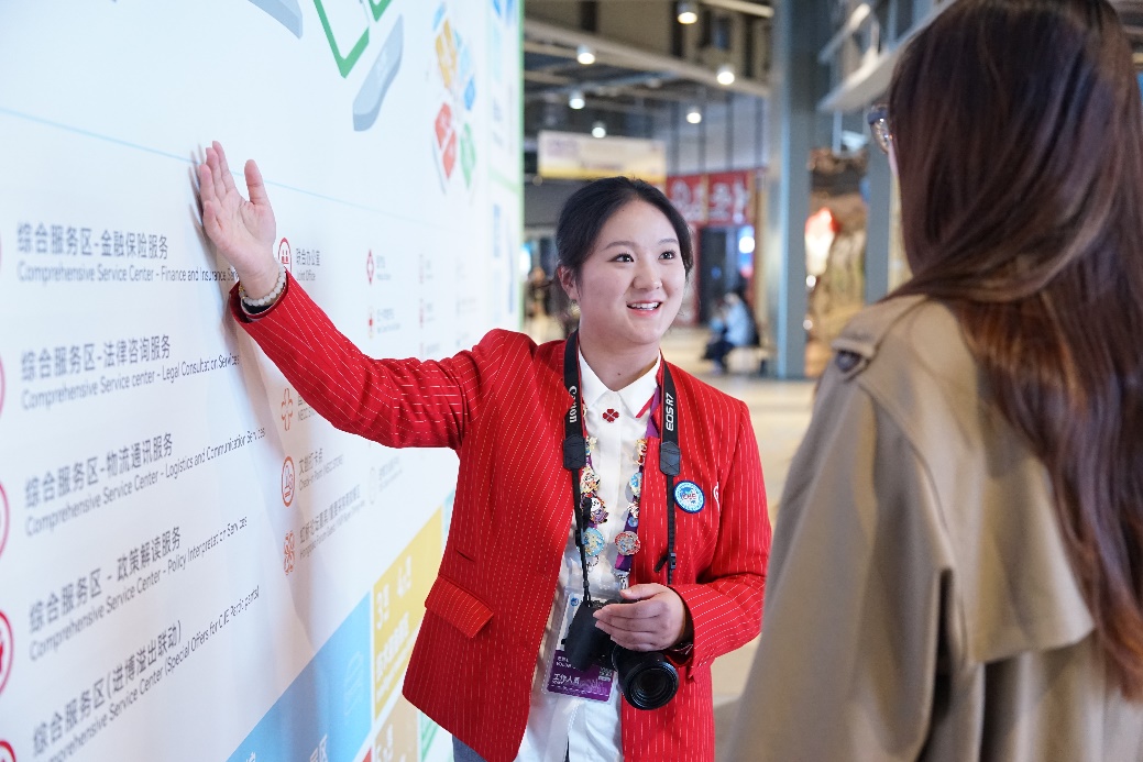 影视传媒学院的赵从杨,来自贵州大山的彝族女孩,作为进博会志愿者,担任媒体组负责人,为进博会宣传工作提供支持服务,保障媒体采访和重点活动报道工作。她以少数民族志愿者的身份,在进博会上讲好进博会开放、包容的故事,当好国际交流的青春使者。