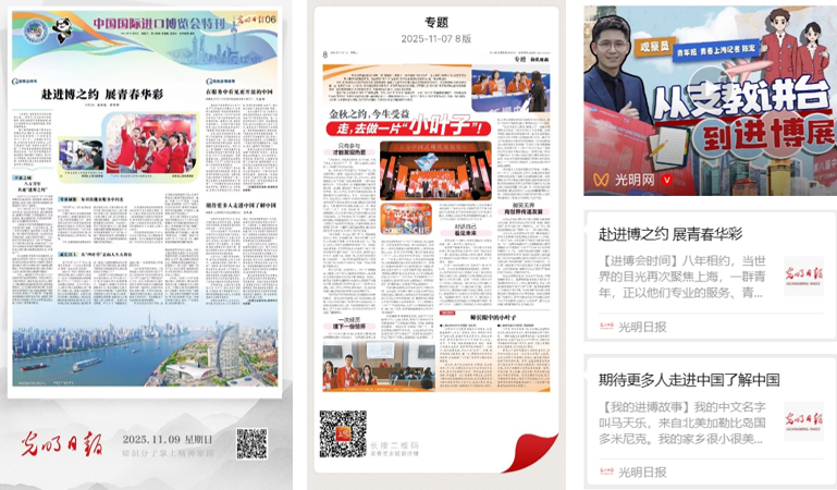在本届进博会会展期间,多名上海师大“小叶子”的优秀事迹被光明日报、新民晚报、上海教育电视台、青春上海、青年报等多家媒体报道,诠释了新时代青年勇担使命的青春担当。