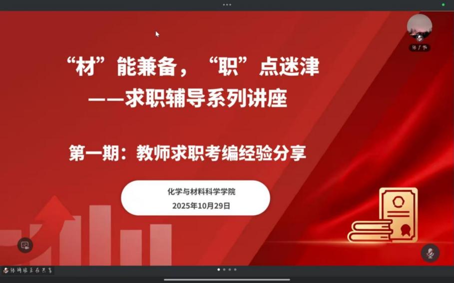 为助力毕业生精准把握职业方向、提升求职核心竞争力,化学与材料科学学院重磅推出“材”能兼备,“职”点迷津——就业指导系列讲座。活动聚焦教师考编、行业趋势、职场软实力三大维度,涵盖考编经验解析、化学前沿动态、HR视角下的能力模型构建、简历优化技巧及全真模拟面试等实用内容。通过“经验传授+实战演练+资源对接”的立体化辅导模式,为化材学子搭建起通往理想岗位的桥梁。