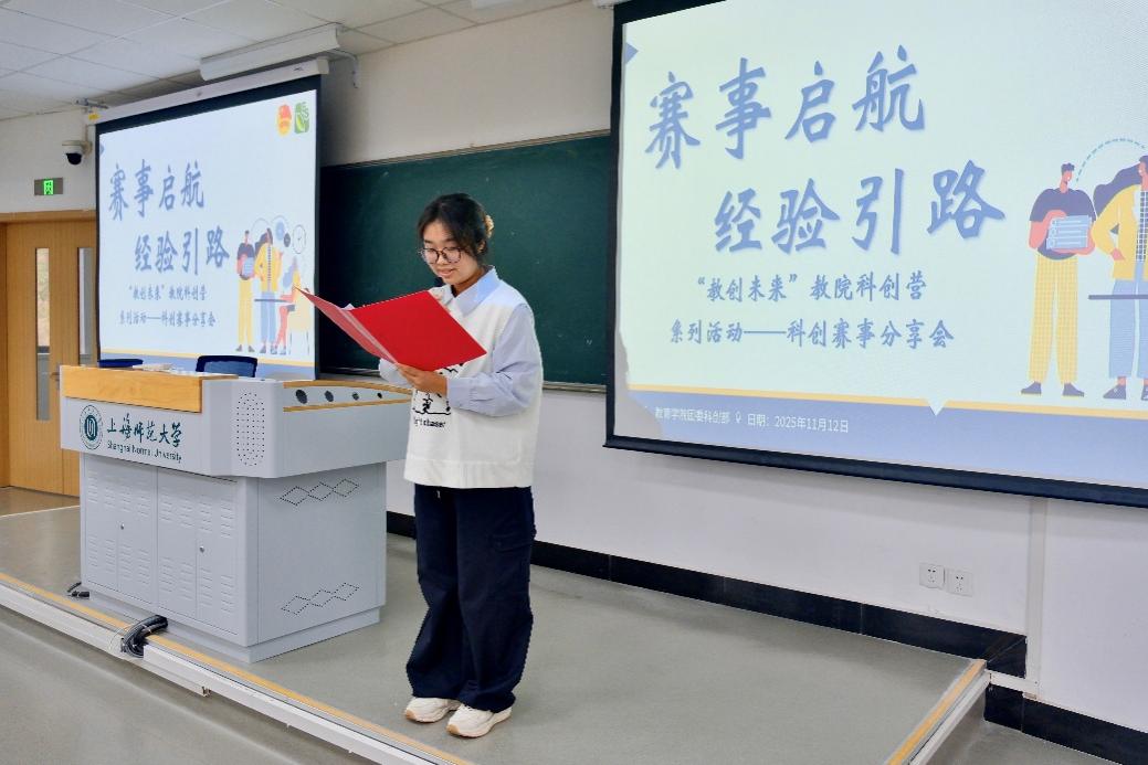 为扎实推进教育学院“教创未来”教苑科创营活动,帮助学子洞悉科创赛事脉络、掌握备赛核心技巧,11月12日13:00,以“赛事起航 经验引路”为主题的科创赛事分享会于奉贤校区2教221室如期举行,团委(学生)副书记李宛蓉及科创部干事出席本次活动。