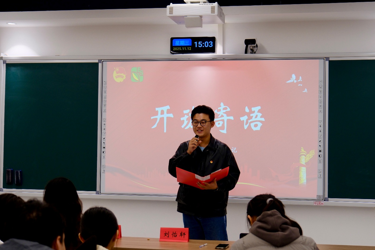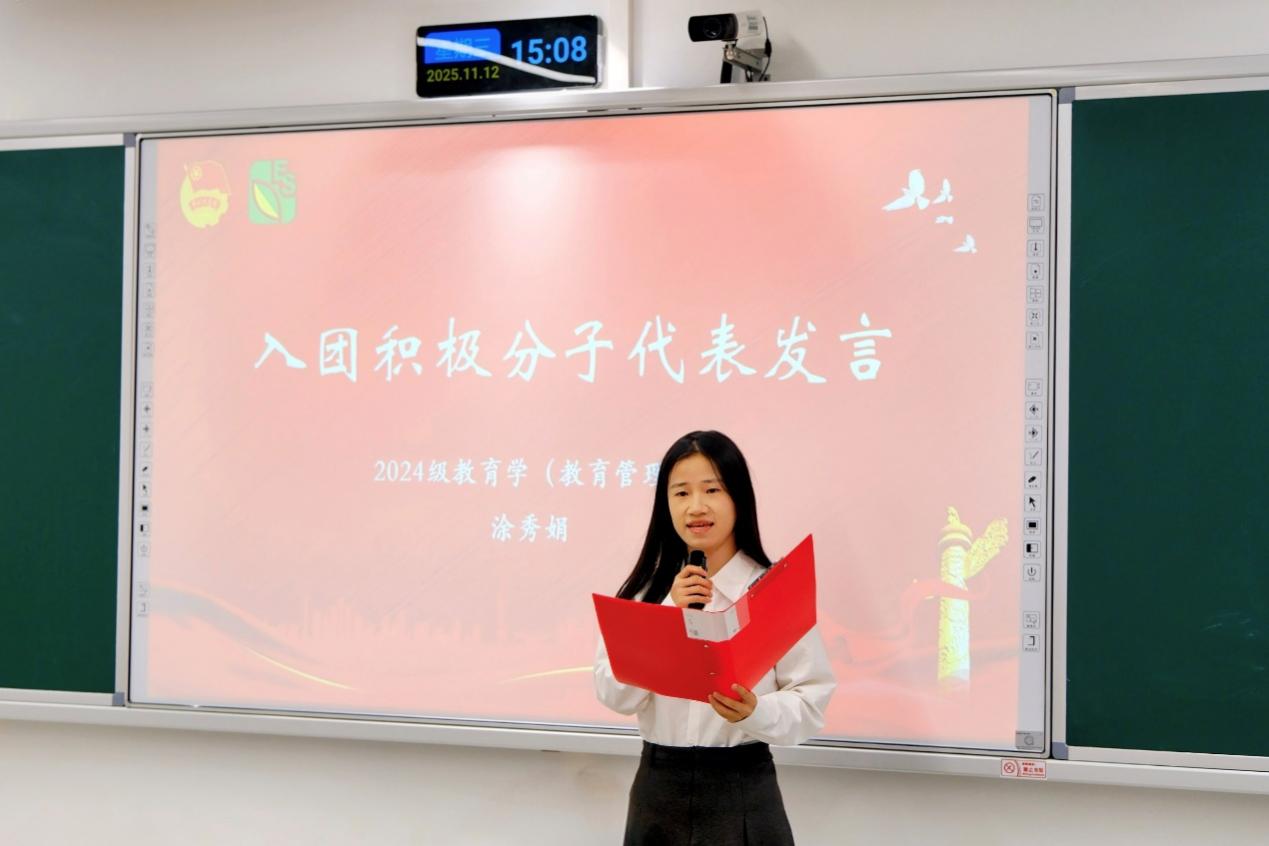 倾听青年心声,凝聚奋进力量。2024级教育学(教育管理)专业涂秀娟作为入团积极分子代表发言。她结合自身参与志愿服务和乡村振兴调研的经历,分享了对共青团组织的向往与感悟,并呼吁全体入团积极分子增强学习主动性,为成为一名合格共青团员奠定坚实基础。
