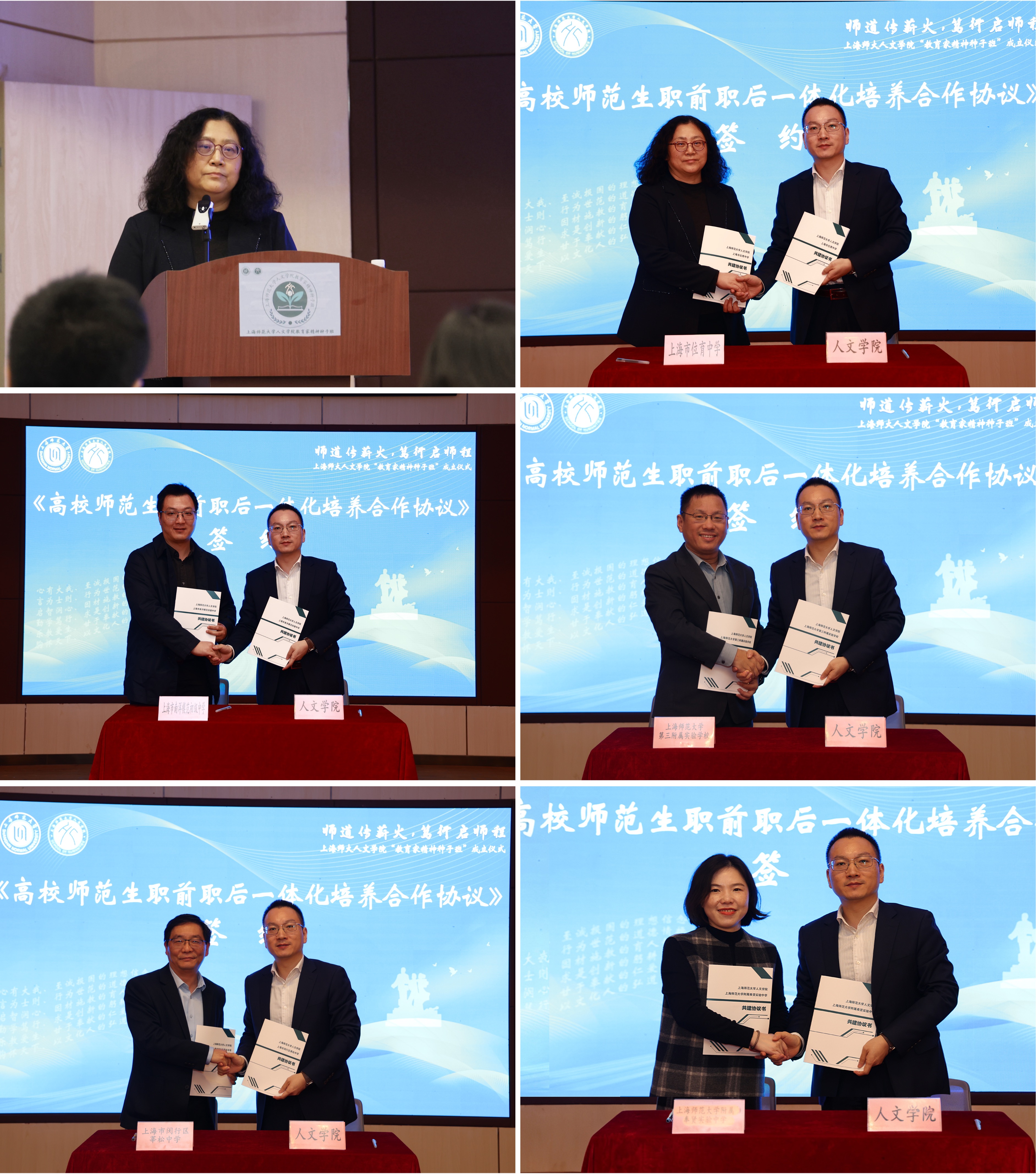 机制的关键创新在于“多元主体协同”。仪式上,人文学院与上海市位育中学、上海市南洋模范初级中学、上海师范大学第三附属实验学校、上海市闵行区莘松中学和上海师范大学附属奉贤实验中学等五所优质中小学现场签署了首批“职前职后一体化培养合作协议”,协议中明确大中小学在职前培养目标中,共同提升师范生的教师情怀、理论素养、专业技能、实践能力,实现从“新手”到“准优秀教师”的转变;在职后培养目标中,共同助力中小学在职教师更新教育理念、提升教学与研究能力,实现从“经验型”到“研究型”“专家型”教师的跨越,这标志着大学与中小学协同培养教师的“立交桥”正式贯通。人文学院中文系1986级校友、上海市位育中学校长王亦群在发言中表示,“这不仅是协议的签署,更是责任与梦想的联结。我们将从‘用人方’转变为‘共同培养方’,开放优质教育资源,与上师大共同探索教育家成长的早期培育规律。”