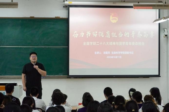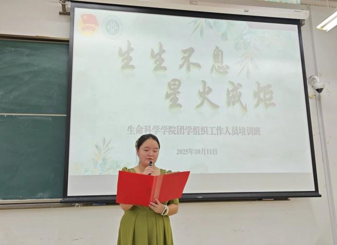 10月11日下午13:00,生命科学学院2025级团学组织工作人员培训班开班仪式在三教402举行。生命科学学院团委书记徐昊天、兼职辅导员张丽莹和主要学生骨干出席开班仪式。院学生会秘书部部门负责人赵博洋主持仪式,团学组织全体工作人员参加培训。