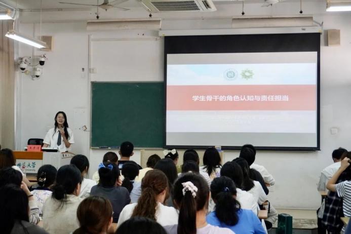 校学生会执行主席王彦清结合自己的学生工作经历,分享了学生骨干的角色认知与责任担当。她认为,团学组织工作人员既要在时代方位中找准“定盘星”和“导航仪”,做好政治引领的排头兵、服务同学的贴心人、挺膺担当的先锋队和自我革命的示范者;还要在知行合一中锤炼“硬肩膀”和“真本领”,担当起紧跟党走的政治责任、赋能成长的服务责任、攻坚克难的实干责任和清新阳光的作风责任。“青春孕育无限希望,青年创造美好明天。”她希望新加入团学组织的同学们牢记投身学生工作的初心,以清晰的角色认知指引方向,以强烈的责任担当砥砺前行,努力成为“政治坚定、作风过硬、同学信赖”的新时代优秀学生骨干。