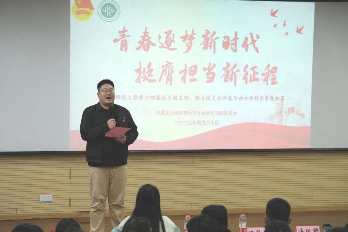 4月20日晚上18:00,2025年上海师范大学第十四届活力团支部、魅力团支书评选活动生命科学学院初赛在奉贤校区第二教学楼102教室举办。院团委书记徐昊天老师、辅导员屠跃邺老师、杨华琛老师、刘洪洋老师、严梦琦老师、院团委(学生)兼职副书记胡铭源、院学生会主席团成员李天祥、校团委组织部基层团建组组长许佳颖出席活动并担任比赛评委。