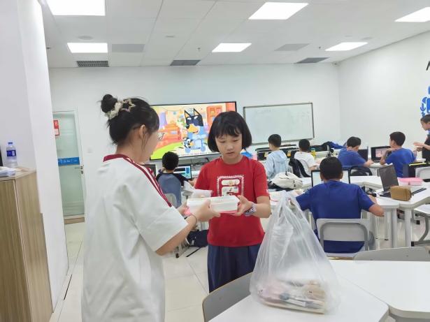 学院与上海市青少年活动中心首度携手,学院学生进入上海少年科学院2025年暑期科技社团担任班主任及助教,把“人工智能+教育”课堂搬进青少年科创现场。志愿者以班主任身份全程守护,课前引导孩子有序签到、安全入场;课堂中化身小助教,协助主讲教师指导小学生用温度传感器、光线模块与图形化编程积木亲手搭建“智能小气象站”“声光互动小屋”等装置,让抽象算法变成可触可感的科学魔法;午间,他们又变身暖心大哥哥和大姐姐,分发餐食、维持秩序,用细致关怀保障教学互动流畅进行。