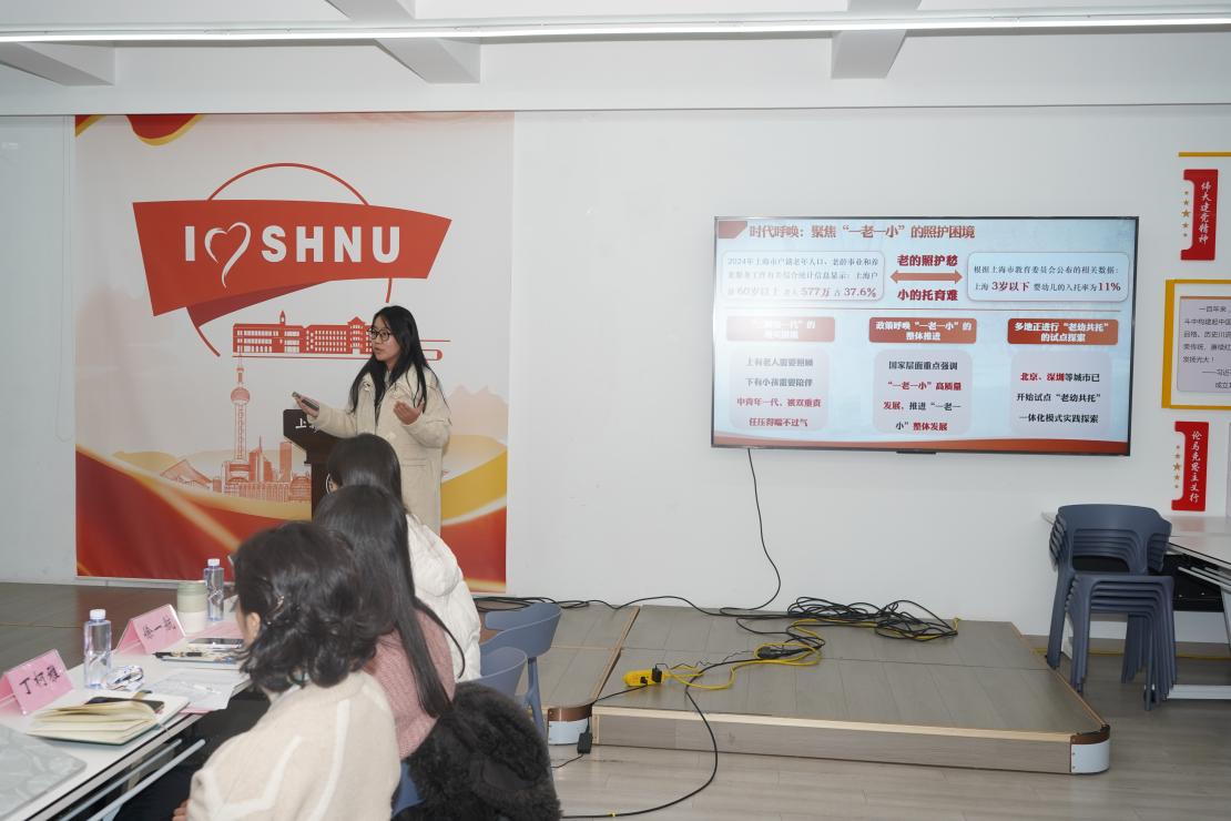 随后,“老幼共托调研团”项目负责人张艺潇进行现场展示,生动呈现出学前学子围绕“一老一小”议题所开展的社会调研与实践探索。