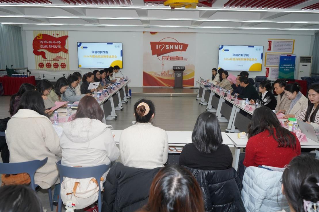 为更好培育2026年度高级别学生竞赛项目,切实提升学院科创项目质量,1月14日下午,学前教育学院2026年度高级别学生赛事选题会于徐汇校区东二党建活动中心顺利举行。校团委书记黄雨艳,校创新创业学院专职副院长戴宁宁,校团委副书记毕冉、社会实践中心主任郝思嘉,上海市盲童学校党支部书记张杨莉、副校长周芳、教育发展中心副主任吉沁、学前教研组组长高勤,学前教育学院党委书记杨成龙,党委副书记、副院长周泽龙及学院专业教师代表、辅导员代表及学生项目负责人共同参与。会议由周泽龙主持。