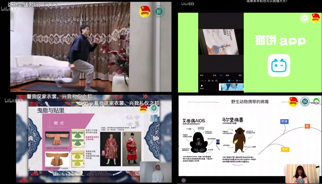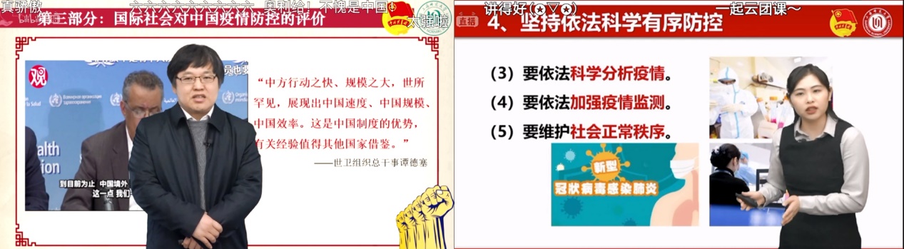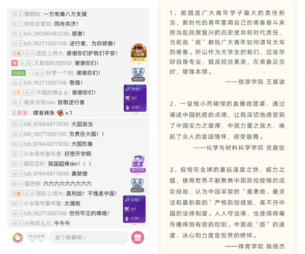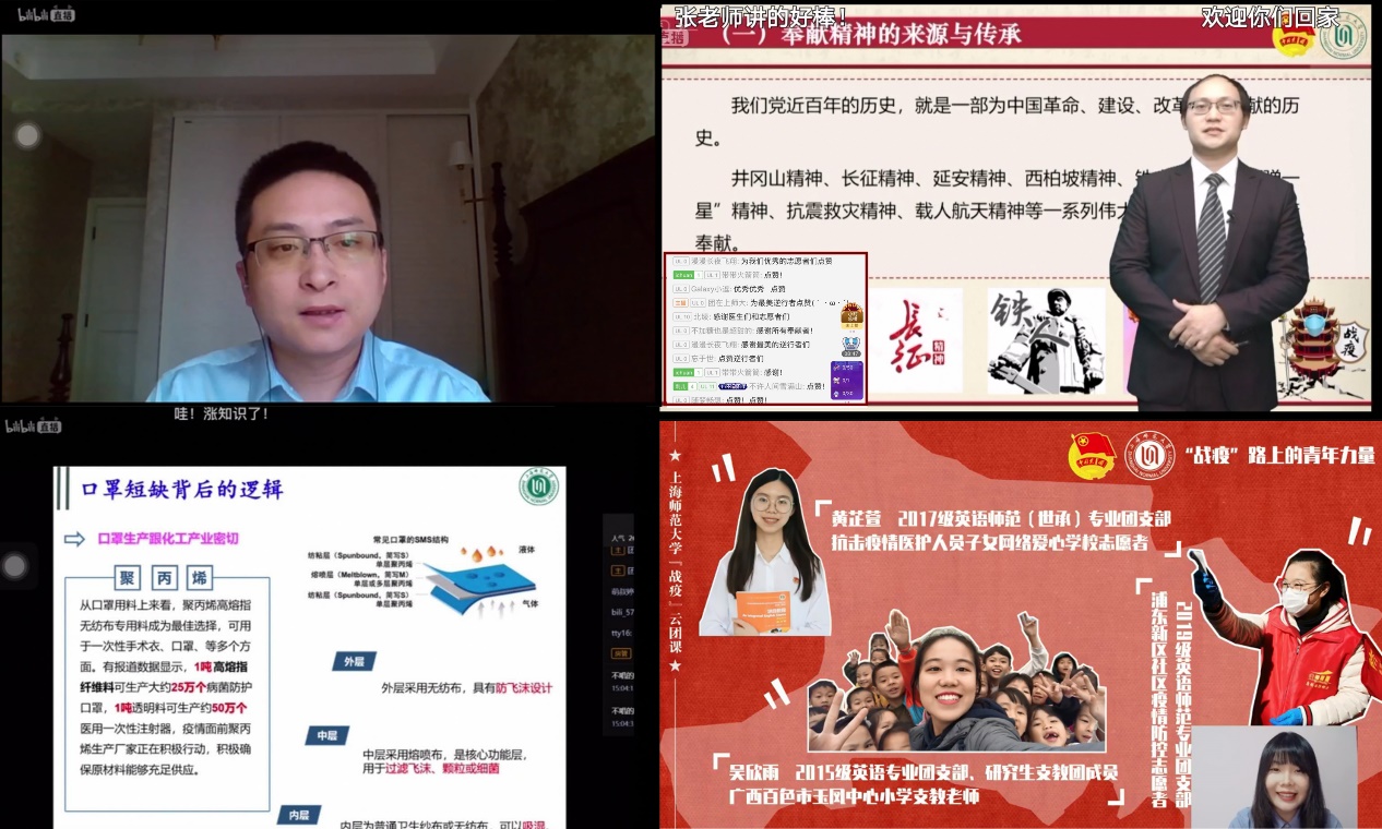 本次系列“战疫”云团课共23期,围绕“全球战‘疫’中的中国力量”“疫情防控中的家国情怀”“疫情期间大学生怎么做”“疫情下的情绪管理”“防疫进行时,宅家全攻略”五大主题,邀请名师教授、战“疫”志愿者、青年团干、优秀团员等,通过“哔哩哔哩”视频平台直播间进行线上授课。云团课一经推出,就在学生中引起热烈反响。“张老师讲得太好啦!”“蔡老师,我很喜欢你的课!”“给超哥打call!”“来支持学长学姐,礼物刷起!”课程直播中,同学们在弹幕区刷屏发送自己对于课程内容的看法与观点,一键开启“云讨论”“云点赞”模式。不少同学还将课程截图、个人感悟晒在了朋友圈,收获好评如潮。