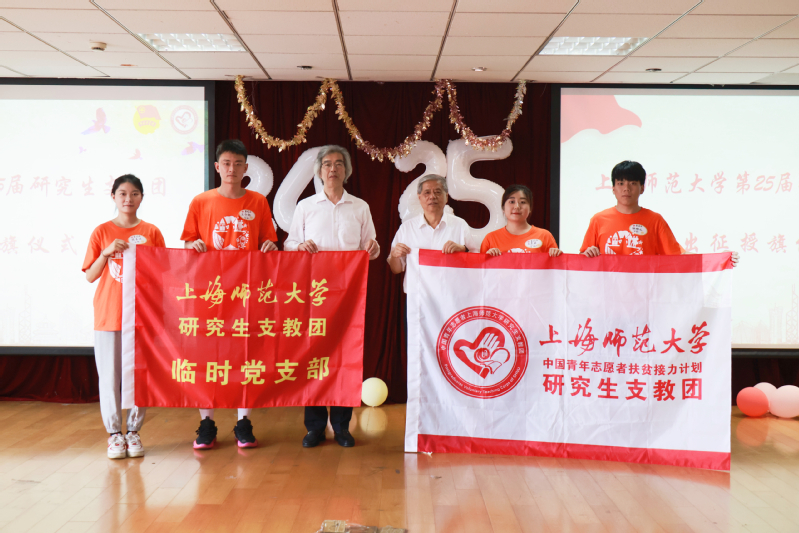 出征仪式上,曹光明、韩烽火为第25届研究生支教团授旗,寄语研究生支教团成员们要牢记习近平总书记的重要嘱托,胸怀“国之大者”,肩负光荣使命,到祖国最需要的地方施展抱负、建功立业,让青春在全面建设社会主义现代化国家的火热实践中绽放绚丽之花。