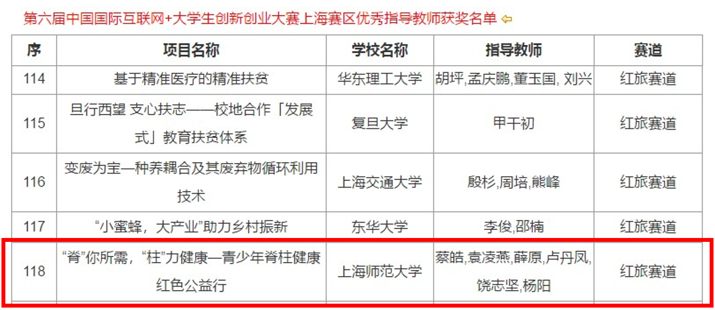 近日,体育学院由蒲锐负责,陈子扬、赵莉、何金玉、项杨阳、张帅五名研究生为骨干及本科生组成的“脊先锋”项目团队,在蔡皓院长、袁凌燕教授、薛原副院长、卢丹凤副书记、饶志坚老师和杨阳老师的指导下完成的《“脊”你所需,“柱”力健康—青少年脊柱健康红色公益行》项目荣获本届“互联网+”赛事上海赛区银奖,这是体育学院在该项赛事中的首枚奖牌,也是我院迄今为止唯一一块银奖,实现了零的突破。