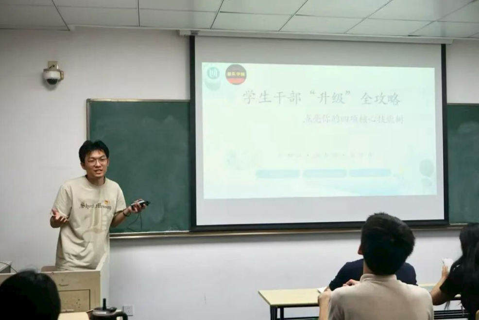 研究生团总支书记陈曦以“游戏视角”解读成长。他鼓励大家将挑战视为“副本”,技能视为“技能点”,进阶点亮每个人的“核心技能树”。针对时间管理、有效沟通等挑战,他给出了实用“攻略”:四象限法则、非命令式沟通、PDCA循环……案例生动,互动频频,让经验轻松落地。