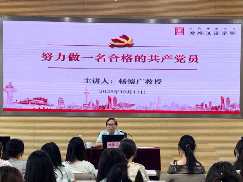 为深入贯彻党的教育方针,引导2025级研究生新生坚定理想信念,积极向党组织靠拢,2025年10月11日,对外汉语学院特邀上海师范大学原校长、学院党建工作督导杨德广教授,作题为“ 努力做一名合格的共产党员”专题讲座。讲座由学院副院长李文浩主持。