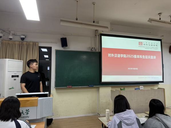 为响应国家征兵号召,增强学生国防意识,鼓励青年学子投身军营、报效祖国,10月20日晚,对外汉语学院于奉贤校区第四教学楼A座202举办2025年征兵动员宣讲会。本次宣讲会特邀商学院2023级退伍军人任杰同学担任主讲,2025级新生们积极踊跃地参与其中。
