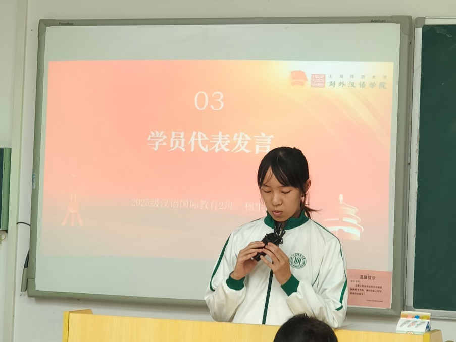 2025级汉语国际教育2班穆生雨訢同学作为学员代表,分享了自己的向往与决心。她动情地说,从身边优秀团员在学术竞赛、社区服务中冲锋在前的身影里,看到了共青团组织的先进性与凝聚力。