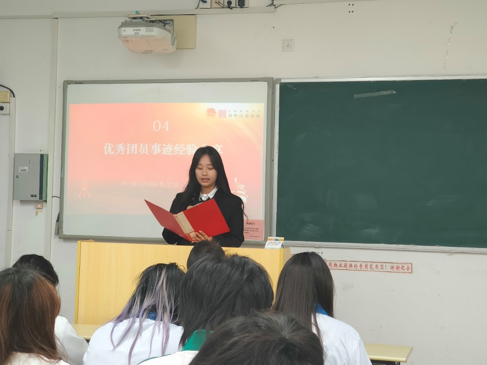 榜样的故事最能激发前行的力量。2024级汉语国际教育2班的优秀团员代表陈启宁同学,用朴实的语言分享了她的成长与蜕变。