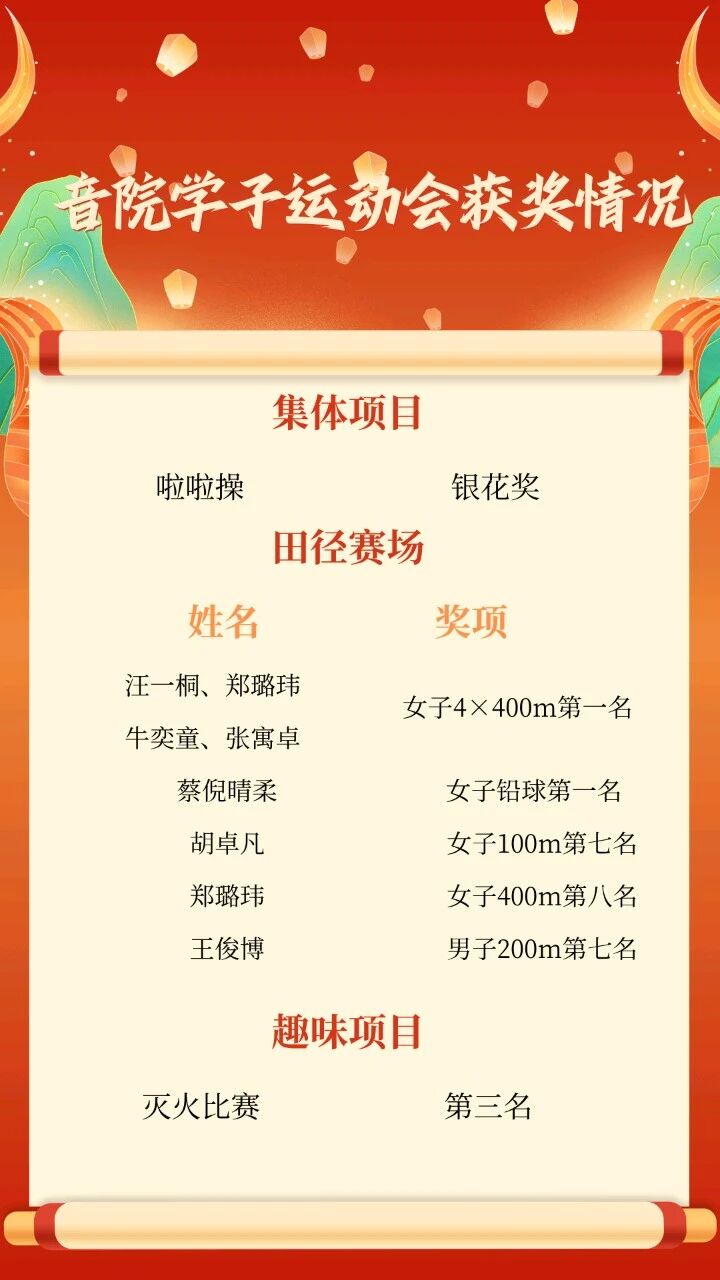 在第37届校运会中,音乐学院学生在多项比赛中硕果累累,共获奖7项。其中在啦啦操比赛中获得银花奖,田径类比赛共获奖5项,第一名2项,第七名2项,第八名1项。在趣味类比赛中共获奖1项,其中第三名1项。