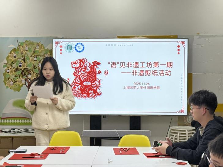 活动伊始,讲解员韦苏颖为同学们系统梳理了剪纸艺术的千年发展脉络,重点介绍了徐汇区国家级非物质文化遗产“上海剪纸”的文化内涵。通过她生动的讲述,剪纸技艺从历史深处走来,焕发出可触可感的时代魅力。讲解过程中,她向在场同学发出热情号召,鼓励大家主动成为非遗的“青春代言人”,善用外语专业的独特优势,向世界讲述中国非遗故事,让剪纸艺术在新时代的国际传播舞台上绽放光彩。