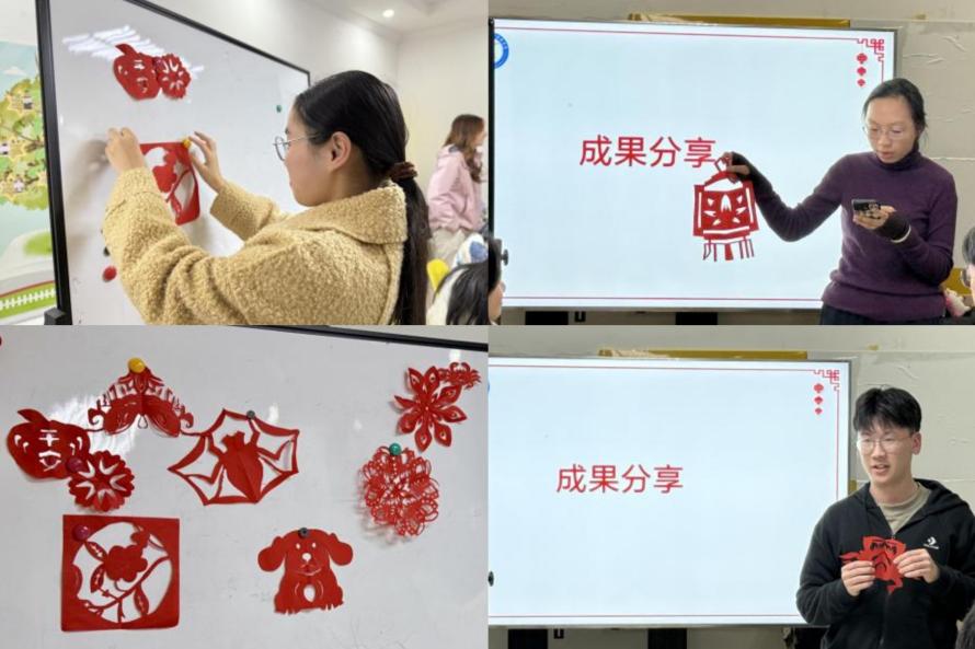 成果分享环节,同学们手持作品登台展示,将剪纸贴于展板并标注“福(Blessing)”“梅花(Plum Blossom)”等双语名称,以流畅的外语阐述创作理念与作品美好寓意。从中式灯笼的吉祥寓意到蟹纹图案的谐趣表达,从非遗元素的现代转化到传统美学的当代诠释,同学们用语言架起文化沟通的桥梁。每一次构思的突破、每一处技巧的磨炼,都在交流中汇聚成非遗传承的青春力量。