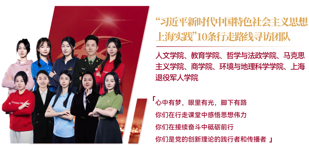 由人文学院、教育学院、哲学与法政学院、马克思主义学院、商学院、环境与地理科学学院、上海退役军人学院组成的“习近平新时代中国特色社会主义思想上海实践”10条行走路线寻访团队,通过情景演绎展示了他们开展10条路线33个点位寻访,在行走中用党的创新理论凝心铸魂,体悟改革开放的生动实践故事。